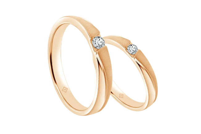 Bagi Anda yang menyukai gaya minimalis, pilihlah cincin dengan rangka (band) yang tipis. Kesan mungil dan rapi akan membuat jari pasangan terlihat lebih jenjang. Meskipun desainnya sederhana, keunikan warna emas rose gold tetap akan membuatnya terlihat istimewa dan tidak membosankan.